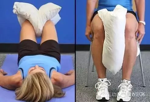 平卧位或坐位,双腿弯曲,双膝中间夹一个枕头,双膝同时用力并保持5秒后放松,重复10次为一组。