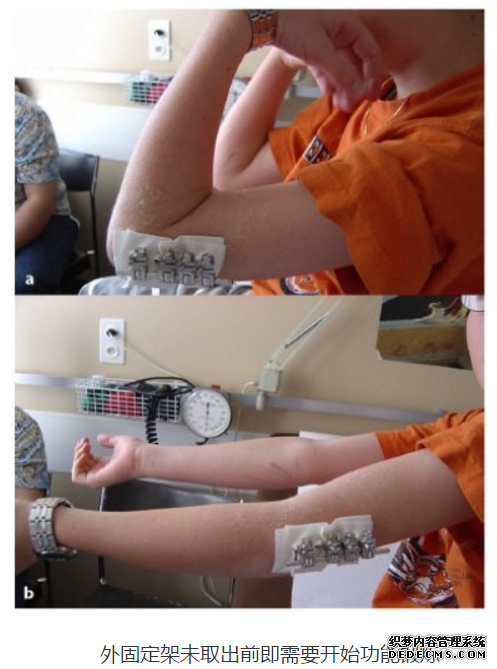 肘关节是人体容易发生僵直和骨化性肌炎的部位,应在医生的指导下进行早期锻炼,遵从先主动肌肉舒缩、再被动牵拉、最后抗阻练习的原则。按照康复的进程,先增加锻炼的频率(早期每次10-15分钟,每日2-3次),后加大锻炼强度
