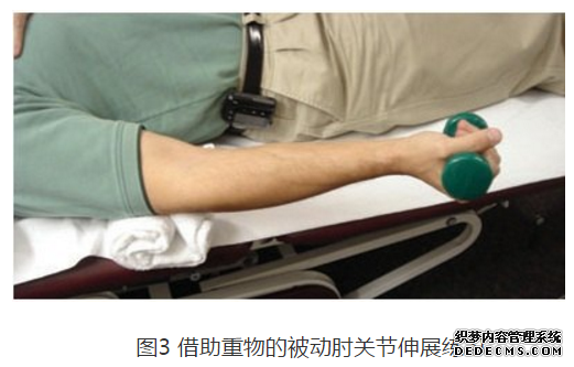 肘关节伸展亦可由患者自行练习,采取坐位,伸肘,拳心向上,将肘部支撑固定于桌面上,小臂及手悬于桌外。肌肉完全放松,使肘在自重或握持哑铃等重物作用下缓慢下垂伸直。伸肘练习主要是帮助肘关节前方软组织的伸展,应注意避免暴力,掌握低负荷(哑铃重量从轻到重,慢慢增加),较长持续时间的原则。