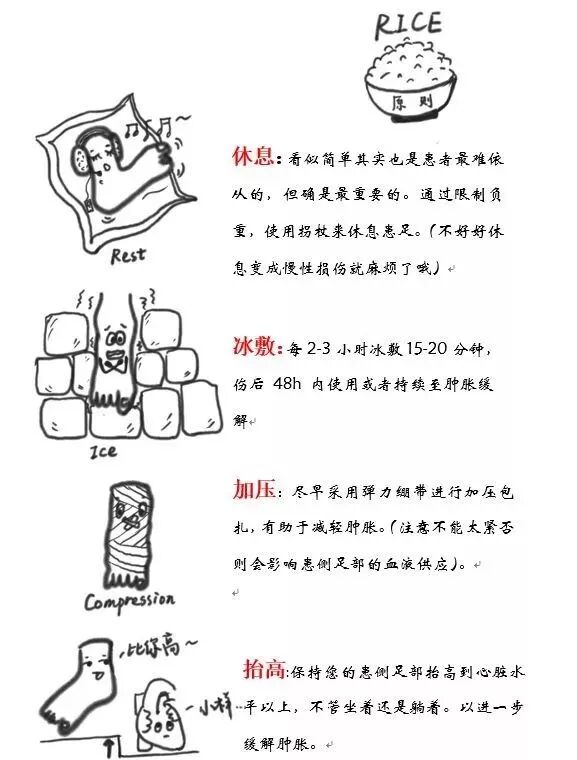 一般来说急性的单纯踝关节扭伤不伴有骨折大都可以通过保守治疗,以下是经典的RICE原则(大米原则)。