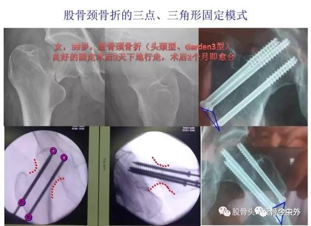 图8?三点三角形固定模式:三枚空心钉在空间呈三角形布局,钉体贴近股骨颈皮质,钉头达软骨下骨;坚强固定利于骨折愈合