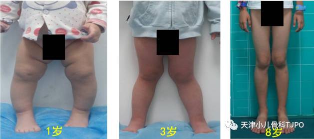 是不是所有的" O 型腿 "(膝内翻)和" X 型腿 "(膝外翻)都是异常的呢? 让我们看下面一组图片,这是一个来门诊看病的小朋友, 1岁的时候家长因为孩子" O型腿 "来就诊,我们告诉家长观察;3岁的时候家长又带孩子来就诊,这次是因为" X型腿 ",我们仍然告诉家长观察;等到孩子8岁的时候复查可以看到 "X型腿 "已经基本变直了。