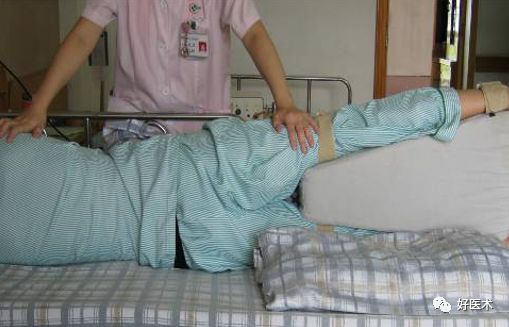 2、让病人稍屈曲健侧膝关节,在两膝间放置2-3个枕头,高度以病人双侧的髂前上棘之间的距离再加上5厘米,操作者一人双手分别放至病人的肩和腰部,另一人维持患肢轴向牵引力,两人同时将病人翻向健侧,将患肢置于两膝间的枕头上,保持患肢呈外展15度、髋膝伸直位牵引,然后在病人的背部垫软枕,胸前放一软枕放置上肢。