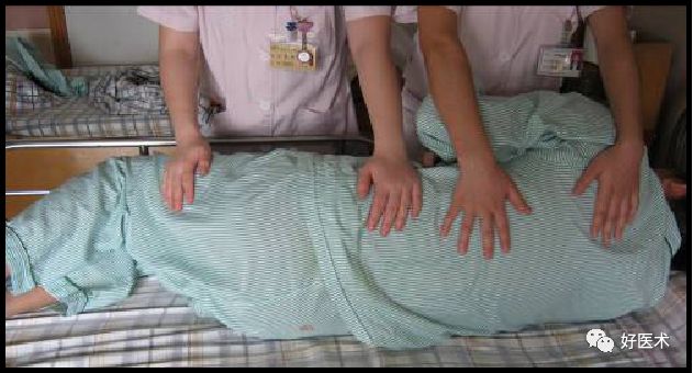 1、操作者分别站在病人患侧的床边,先将病人的双手放于胸前,让病人屈曲健侧膝关节,操作者一人双手分别放至病人的肩和腰部,另一人将双手分别放至病人患肢的膝部小腿维持轴线牵引,先让病人健侧下肢配合用力,同时将身体抬起移向患侧床沿。