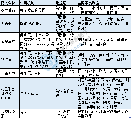 (2)应用初期可发生尿酸转移性痛风发作,故于初始4~8周内与小剂量秋水仙碱联合服用。