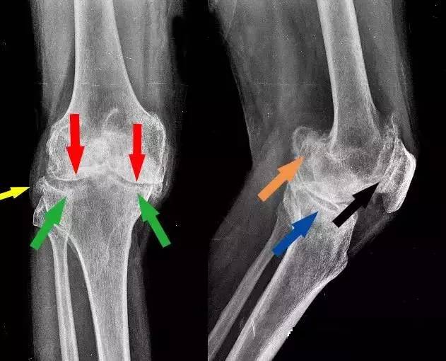 对比可以看到,您的正位片提示:膝关节骨端明显畸形,内、外侧间隙均变窄甚至消失(红箭头),软骨下骨硬化(绿箭头),关节边缘呈唇样变(黄箭头);侧位片提示:髌股关节骨质增生(黑箭头),后髁骨质增生(橙箭头),胫骨平台骨质囊性变(蓝箭头)。