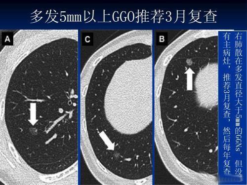 纯磨玻璃结节一般生长非常缓慢,部分病人生长速度在每年1mm左右。因此,纯磨玻璃结节随访过程中,是非常安全的。≤5 mm的纯磨玻璃结节建议每年复查1次;>5 mm的纯磨玻璃结节建议每半年复查1次,连续3年复查后,如果结节无明显变化,仍建议每年复查CT。对于部分实性磨玻璃结节,小于8mm的结节随访也是比较安全的,每3个月随访一次,不会影响手术效果,>8 mm的部分实性结节,每3个月复查,并抗炎治疗,对持续存在的结节采用PET、肺穿刺活检明确病理。随访过程中病灶消散或明显缩小者考虑炎症反应可能。约20%的纯磨玻璃结节会在随访过程中病灶变大,或进展为部分实性结节;约40%的部分实性结节在随访中增大,或实变区增大。对于实性成分≥5 mm磨玻璃结节可以进行肺穿刺活检,明确性质,也可以继续CT随访。