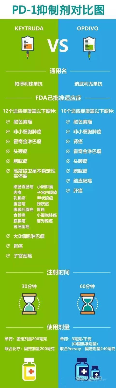 免疫治疗的药物目前在全球上市的有O药、K药、T药、B药,估计未来还会有更多的种类和名字。O药、K药系PD-1单抗。T药、B药系PD-L1单抗。百时美施贵宝的Nivolumab(商品名Opdivo,简称O药,也叫纳武单抗),默沙东的Pembrolizumab(商品名Keytruda,简称K药,也叫派姆单抗)。O药和K药自2014年上市以来在适应证、有效率、不良反应等方面的表现都极为相似。O药比K药价格上略便宜。这两种药物涵盖的适应症非常广泛:包括非小细胞肺癌、头颈部癌、膀胱癌、肝癌、恶性黑色素瘤、霍奇金淋巴瘤、肾癌等等。美国FDA批准K药可以单药用于PD-L1强阳性的肺癌患者的一线治疗,有效率超过40%;或者K药联合化疗一线用于所有肺癌患者,有效率高达55%。当PD-L1表达≥50%的EGFR/ALK/ROS1(原癌基因1酪氨酸激酶)基因突变阴性患者,可以一线使用O药或者K药,对于在化疗、靶向治疗失败的二线及三线治疗上都可以使用这两种药。
