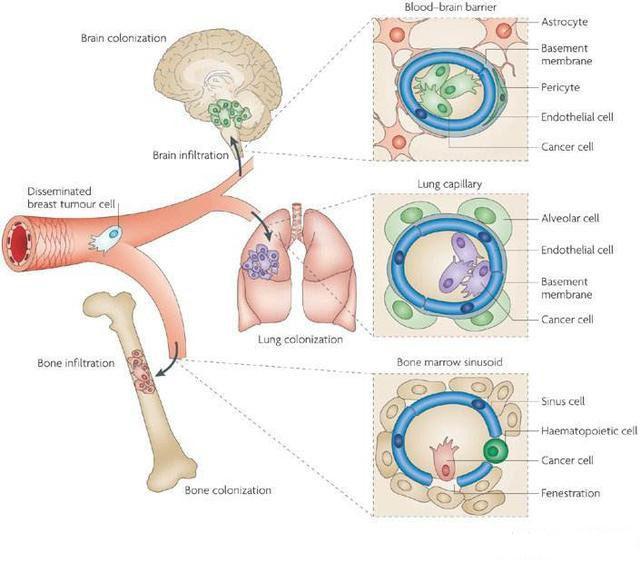 肺癌转移分三个通道,一个是肺癌细胞脱落随着痰液在肺内支气管中流淌,可能到达其他肺叶种植转移,一个是肿瘤细胞进入血液,全身播散转移,还有就是通过淋巴道转移,细胞进入肺内淋巴管道在淋巴系统内播散,典型的就是淋巴结肿大。肺内种植转移和肺癌在肺局部生长症状类似,淋巴道转移主要表现为淋巴结肿大,在此主要介绍一下肺癌其他部位转移导致的症状。