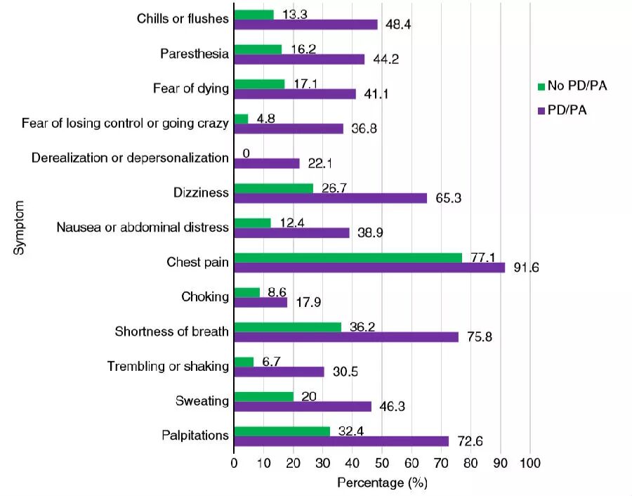 200名急诊患者中,46名(23.0%)受试者满足PD的诊断标准;另外47名(23.5%)受试者满足PA的诊断标准,但尚不满足PD的诊断标准。 换言之,以上述非特异性症状为主诉的患者中,有近一半存在与惊恐相关的问题。 如图1所示,这些患者最常见的症状依次为胸痛(91.6%)、气短(75.8%)、心悸(72.6%)及头晕(65.3%)。