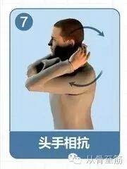 1、旋肩舒颈,项臂争力,:两手交叉,屈肘上举,用手掌抱颈项部,用力向前,同时头颈尽量用力向后伸,使两力相对抗,随着一呼一吸有节奏地进行锻炼。