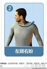 3、回头望月,摇头晃脑:头部转向一侧,头顶偏向另外一侧,双眼极力向后上方观望,如回头望月状,坚持片刻,进行对侧锻炼。