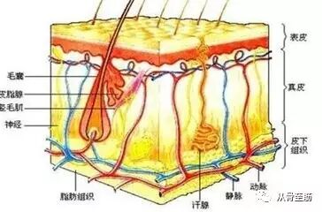 ? ? 首先认识一下我们自已的皮肤:皮肤包括表皮、真皮、皮下组织。神经存在于真皮及皮下组织中。损伤如果深达真皮和皮下组织,就可能会形成瘢痕。新生的血管和神经也在其中生长。?