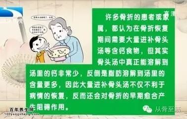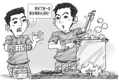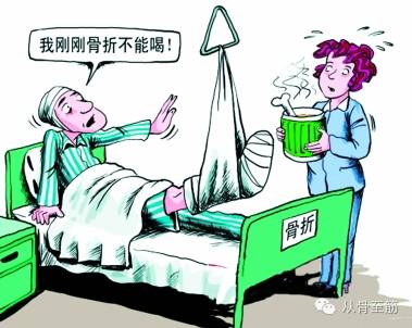 很多骨折病人的家属经常给病人买排骨、炖鸡汤喝,说是喝骨头汤补得快,其实,这是个认识的误区。骨折病人经常喝骨头汤,会因汤汁油腻而降低病人的食欲,且单一的饮食结构,无法满足骨折病人康复过程中所需多种营养成分供给,使骨折延迟愈合,出现事与愿违的效果。骨头汤对骨折愈合的作用有限,少吃无妨,量大无益,不适宜天天喝。