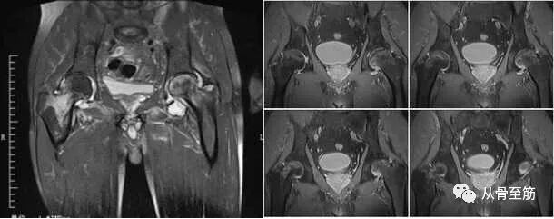 有明确原因的骨髓水肿当然很好鉴别。有一种叫股骨头骨髓水肿综合征的情况有时难以区分,是一种病因未明、以髋关节骨质疏松为特征的自限性疾病。中年发病,男性多于女性,多为单侧受累。临床变现为无明显诱因的进行性髋部疼痛、跛行、髋关节旋转活动受限。核磁共振表现为广泛均匀的骨髓水肿,信号改变可达股骨颈和大转子。自然病程半年至1年,临床症状消失,核磁共振可完全恢复至正常。