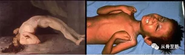 2.典型症状?主要包括肌强直和肌痉挛。通常最先受影响的肌群是咀嚼肌,随后顺序为面部表情肌,颈、背、腹、四肢肌,最后为膈肌。肌强直的征象为张口困难和牙关紧闭,腹肌坚如板状,颈部强直、头后仰,当背、腹肌同时收缩,因背部肌群较为有力,躯干因而扭曲成弓,形成“角弓反张”。阵发性肌痉挛是在肌强直基础上发生的,且在痉挛间期肌强直持续存在。相应的征象为蹙眉、口角下缩、咧嘴“苦笑”(苦笑面容);喉头阻塞、吞咽困难、呛咳(咽肌痉挛);通气困难、发绀、呼吸骤停(呼吸肌和膈肌痉挛);尿潴留(膀胱括约肌痉挛)。强烈的肌痉挛,可使肌肉断裂,甚至发生骨折。患者死亡原因多为窒息、心力衰竭或肺部并发症。上述发作可因轻微的刺激,如光、声、接触、饮水等而诱发,也可自发。病程一般为3~4周,如积极治疗、不发生特殊并发症者,可逐步减轻。但肌紧张与反射亢进可继续一段时间;恢复期还可出现一些精神症状,如幻觉、言语、行动错乱等,但多能自行恢复。