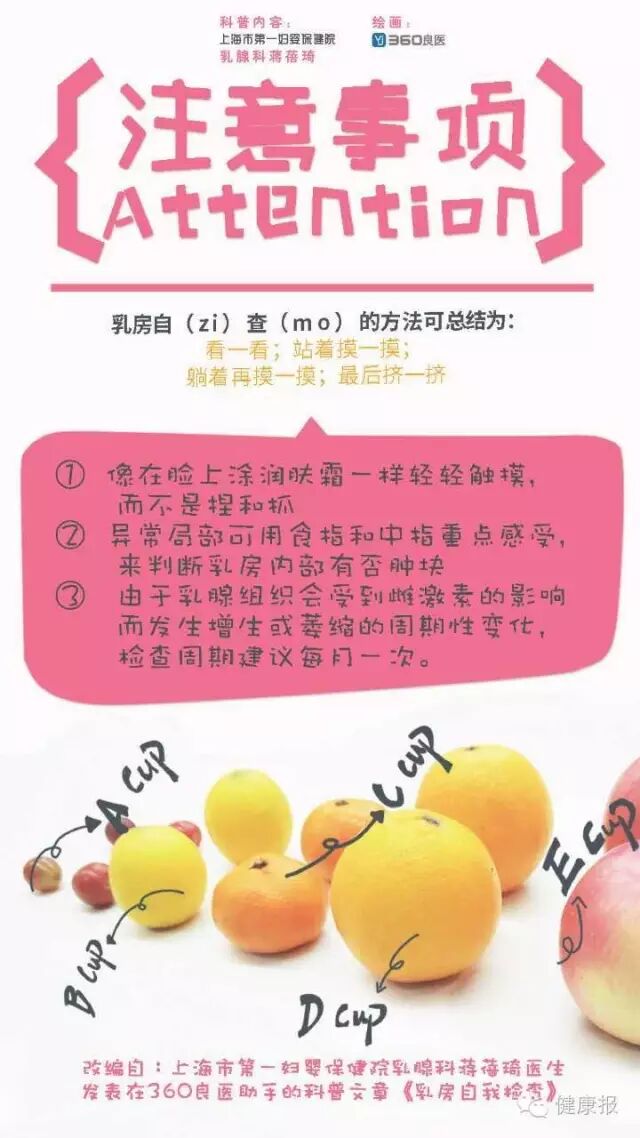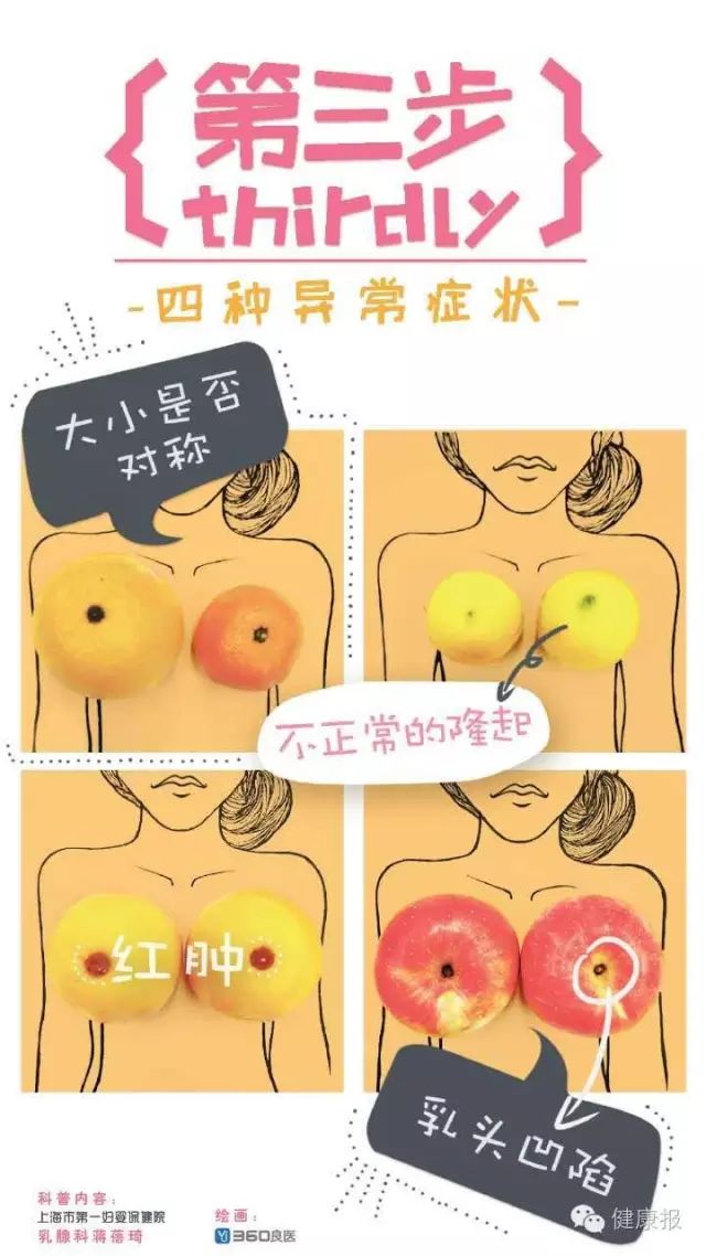 女人天生多了些可能带来麻烦的器官,乳房是其一,但好在它位于体表,这无疑提高了可控性。养成定期自检的习惯,在第一时间发现乳房的异常很重要。方法之一是镜前检查,取站立姿势,双臂垂放于两侧,观察乳房外形,正常的弧形轮廓是否变得不规整,有没有橘皮样的凹点,或是有―个小陷窝,挤压时有无液体从乳头溢出。假如出现以上情况,应尽早看专科医生。二是卧位检查,可平躺在床上,以乳头为中心,用指腹按顺时针方向紧贴皮肤做循环按摩。检查时用力要均匀,以手指能触压到肋骨为宜。如发现有结节或包块,需及时去医院确诊。