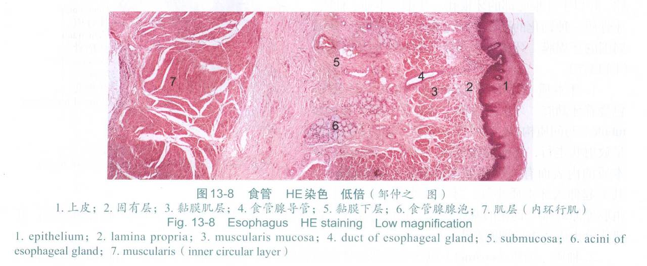 从发病位置看:中段多见(50%),下段次之(30%),上段最少(20%);从病理类型看,我国以鳞癌为主,西方国家腺癌多见;根据病变浸润深度,分为早期癌和进展期癌,早期癌是指病变深度局限于黏膜下层,进展期癌是指病变浸润超过黏膜下层,其中局限于黏膜上皮层的被称为原位癌。(下图为食管HE染色后分层)