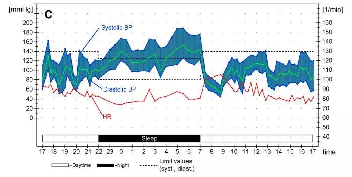 其机制是心血管自主神经衰竭导致的神经源性高血压。有一半的体位性低血压患者同时合并仰卧位高血压。高达 34–46% 帕金森患者有仰卧位高血压。仰卧位高血压的定义是在有明确直立性低血压的人群,在平躺 5 min 之后血压高于 140/90 mmHg。下图是典型的仰卧位高血压患者的血压变化,在清晨起床后出现直立性低血压,发生血压骤降,而夜间平躺后血压又持续高于 140/90 mmHg。对于这种病人,目前共识并不建议服药,这将增加直立性低血压晕倒的风险,而建议夜间睡眠床头抬高 15°。