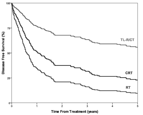以晚期喉癌为例(T4a),我们可以看到接受规范化治疗的患者(全喉切除+术后放化疗,即TL-R/CT,上图最上面那条曲线),五年生存率接近60%。也就是说喉癌患者在接受规范化的治疗后,接近60%的喉癌患者可以生存5以上,当然有的可以更久。其中的一个关键词是接受规范化治疗,这点很重要。如果不是接受手术+术后放化疗的方案可能生存会受影响。可能大多数普通人对这个没什么直观的感觉,我们来做个比较吧,就拿常见的胃癌来说,同样晚期的胃癌五年生存率只有30%左右甚至更低;30%和60%的差别普通人应该有直观印象了吧,通俗地说,10个晚期的喉癌患者6个能活过5年。