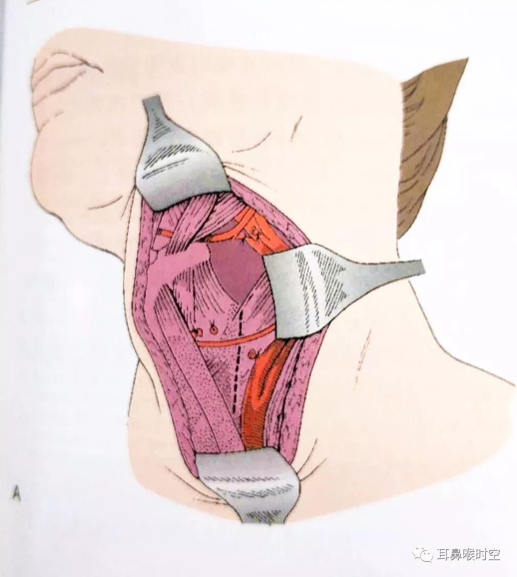 下咽上部(即咽后壁)的病变需行低位侧咽切除术。在甲状软骨板后缘上方切开咽下缩肌,暴露梨状窝黏膜,在甲状软骨板内侧面将其分离。术者及助手牵张梨状窝黏膜,用锐器或电刀切开咽腔(图根治性手术后,需置入一根鼻饲胃管,并双层缝合咽侧切口。使用可吸收缝线内翻缝合黏膜(如Connell法)。单纯间断或8字缝合咽下缩肌及咽中缩肌。留置引流管,分层关闭皮肤切口。若咽侧切口无法关闭,术者需采用其他软组织重建技术,比如植皮术、带蒂瓣、微血管游离皮瓣。植皮术,供体部位并发症最小,并提供薄软组织,但其提供的组织量有限(比如,不适用于舌根重建),且在咽侧切口下缝合困难(咽侧切口联合下颌骨裂开或者其他有效径路,可使缝合变易)。带蒂瓣,如胸大肌肌皮瓣效果可靠且容易获得,主要的缺陷是受重力影响肌皮瓣下垂(缝合口张力力随之增加)以及容和计大。
