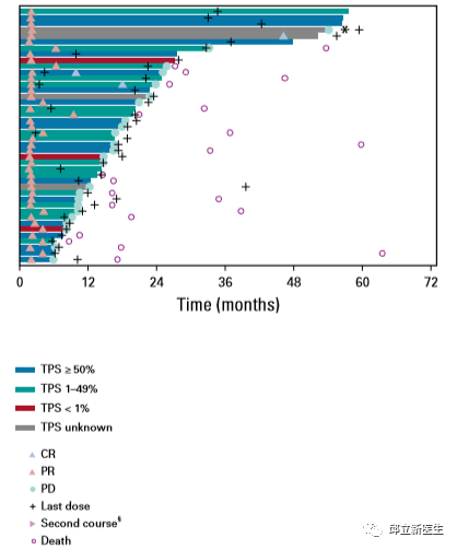 中位随访60.6个月时,18%的患者(100例)仍生存。