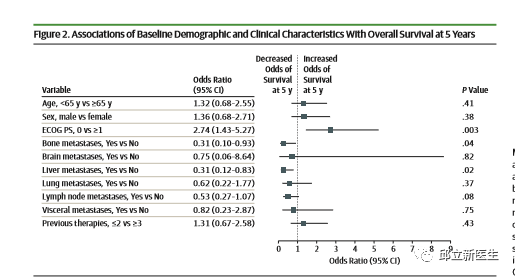 在包括所有患者的多变量分析中,基线存在肝脏(OR,0.31; 95%CI,0.12-0.83; P = .02)或骨转移(OR,0.31; 95%CI,0.10-0.93; P =。04)与5年生存可能性降低独立相关。ECOG表现状态为0(vs≥1)与5年生存率增加相关(HR,0.53; 95%CI,0.40-0.71)。