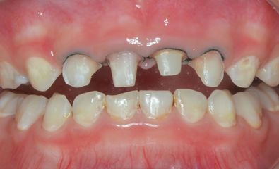 情况越来越严重,家长开始着急,村头摆地摊“100块种牙”的老大爷又说了:“这算事儿吗?换牙就好了,一点不影响!”于是,牙齿就变成这样了: